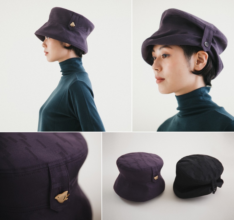 オートクチュールを手がけるオートモード平田とのダブルネーム商品。かすみ柄を織りこんだオリジナルテキスタイルで作りました。サイドにはmatohuロゴの千鳥のボタンも。留め方でくしゅっと潰した表情を出すことができます。