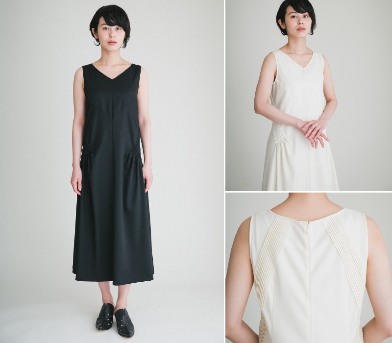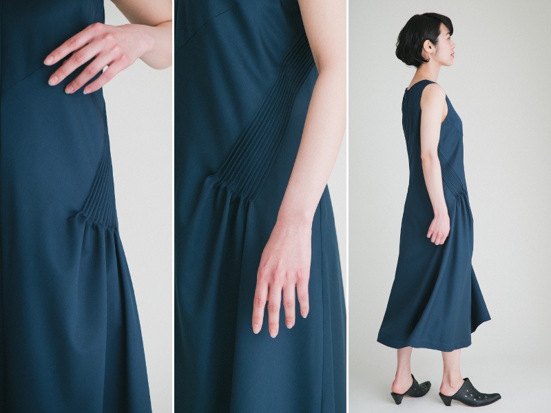背中から前面に向かって斜めに入るピンタックが美しいドレスです。前面のドレープ感は立体裁断によって作られています。上品な光沢感のあるウールギャバジンで、パーティなどの華やかな場にも着ていただきたい一着です。