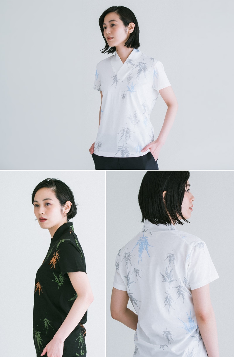 matohu初のランウェイショーを行ったコレクション“嵯峨本”の当時のプリント版を使った新企画の重ね衿Tシャツです。matohuの人気定番アイテムに、プリントTシャツが初登場です。衿もとが着物の打ち合わせのようなデザインになっており、単品でも長着のインナーでも活躍します。
