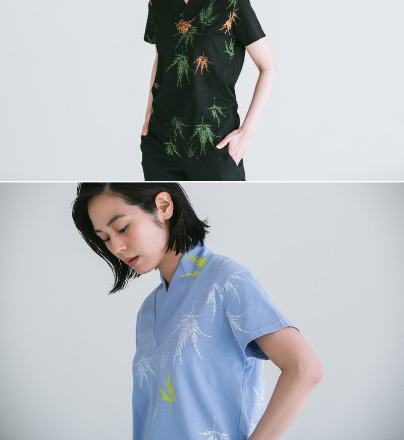 しだれモミジの葉を彫刻刀で彫り、木版刷り独特のかすれまで表現したプリントです。 カットソー地でさらっとした肌触りが暑い日にもおすすめです。