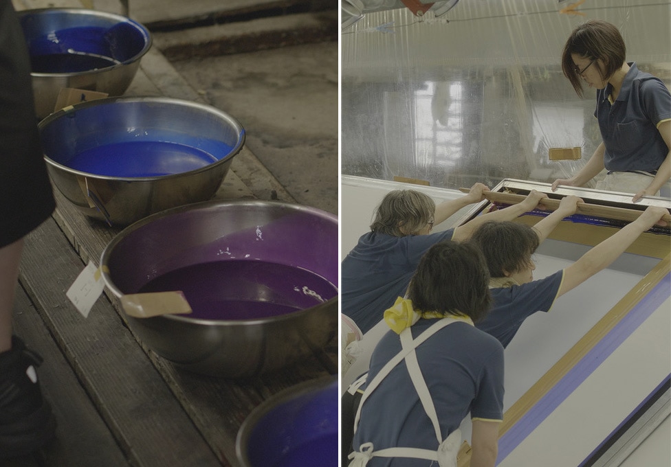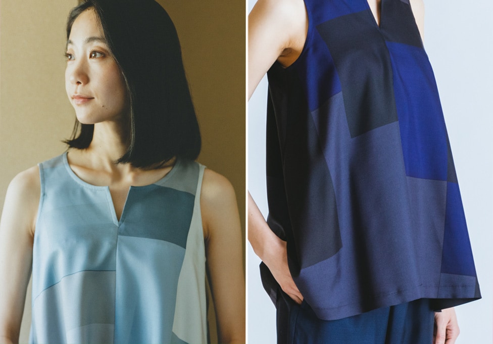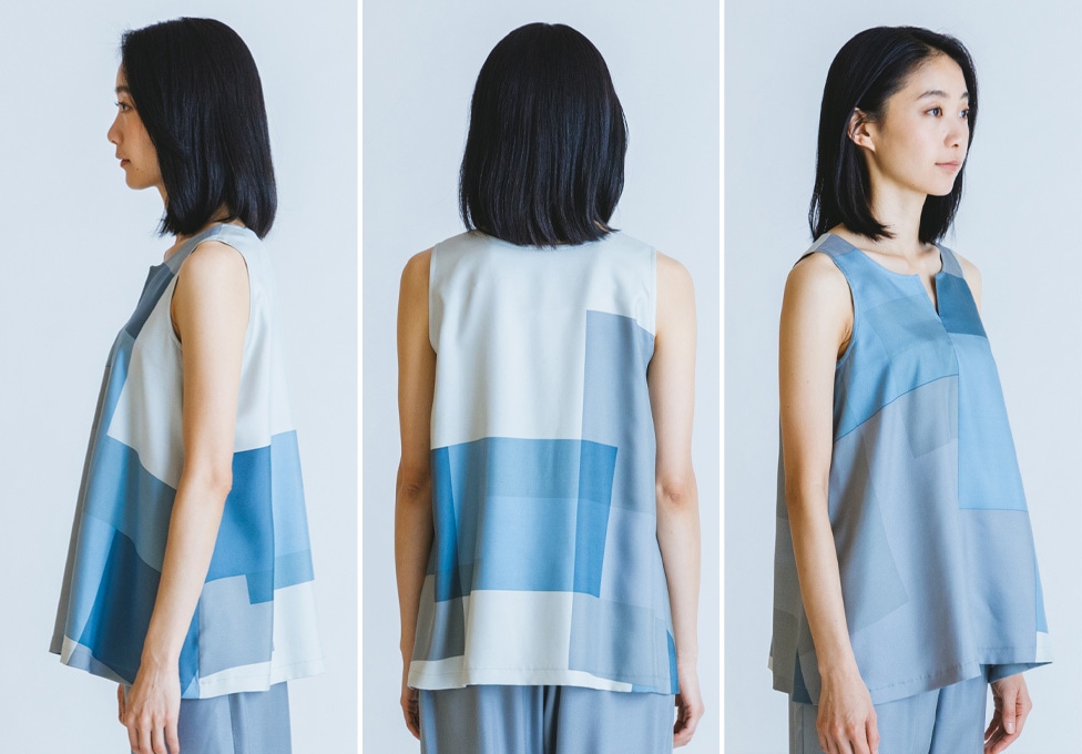 お色は1番色はグレー×淡グレー×ブルーグレーと、2番色は黒×濃紺色をご用意しています。版は3色ですが、色を部分的に重ね合わせることで、繊細な6色の表現になっている「技アリ」のプリントです。染色も山形県鶴岡市で職人さんたちが行っています。