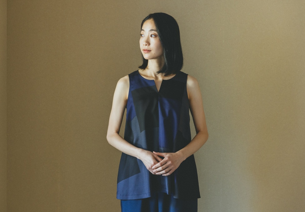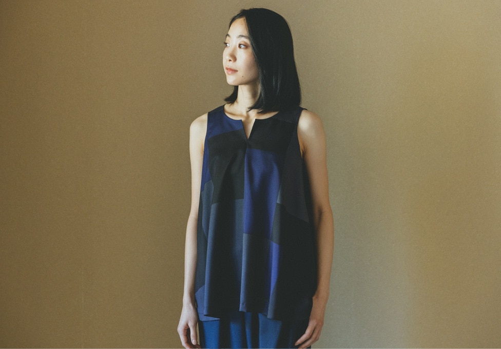 前襟ぐりのスリットは、真っ直ぐの生地にそって入っていますが、着用する時に自然とV字になるように作られています。素材感を生かしたドレープが緩やかに優しく波打ち、適度に体から離れて快適な着心地です。