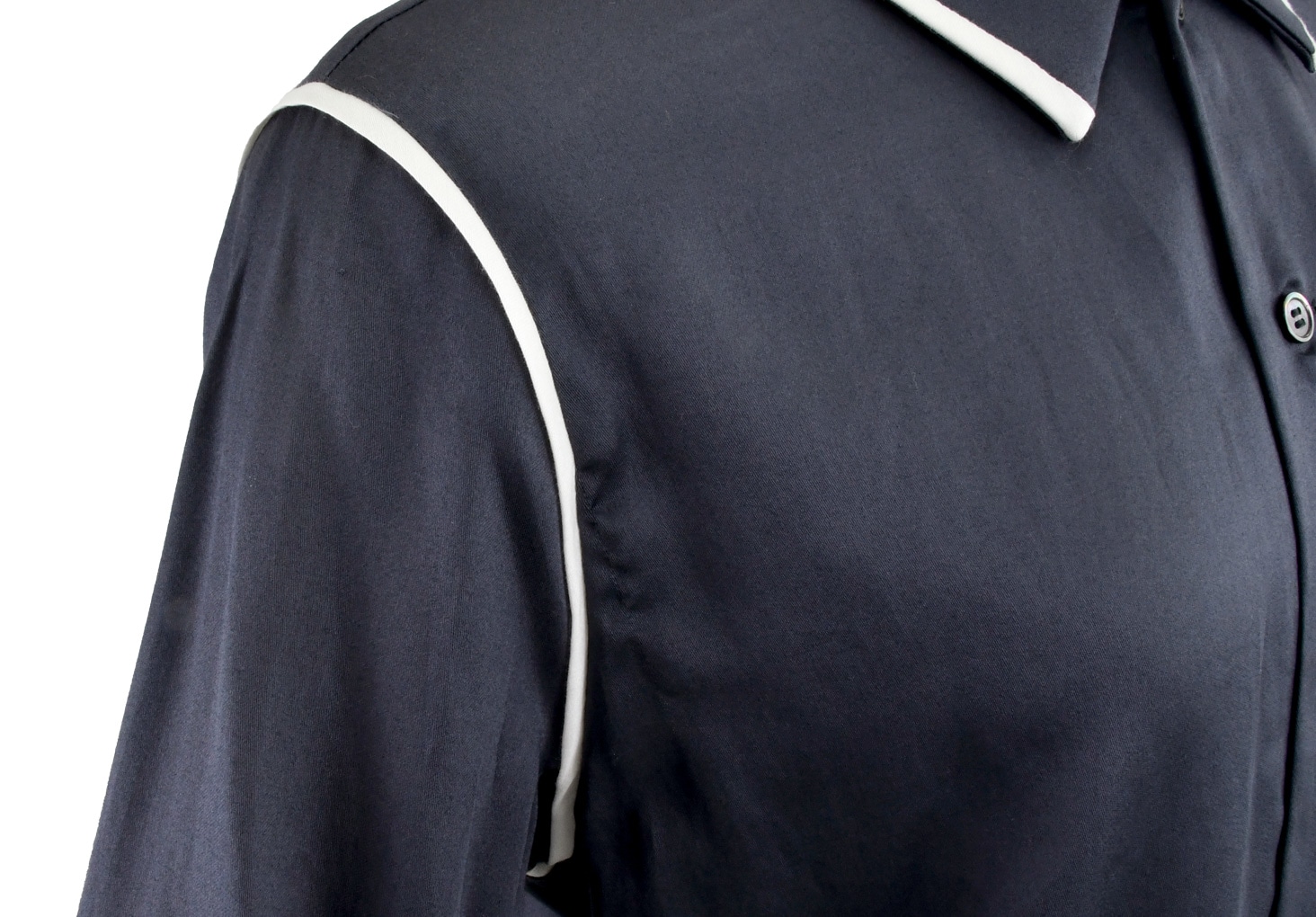 デザインのポイントは襟と袖ぐりとカフス周りに施されたパイピング始末。同じ生地の配色で、6ミリ幅のバイアス地で丁寧にくるんであります。