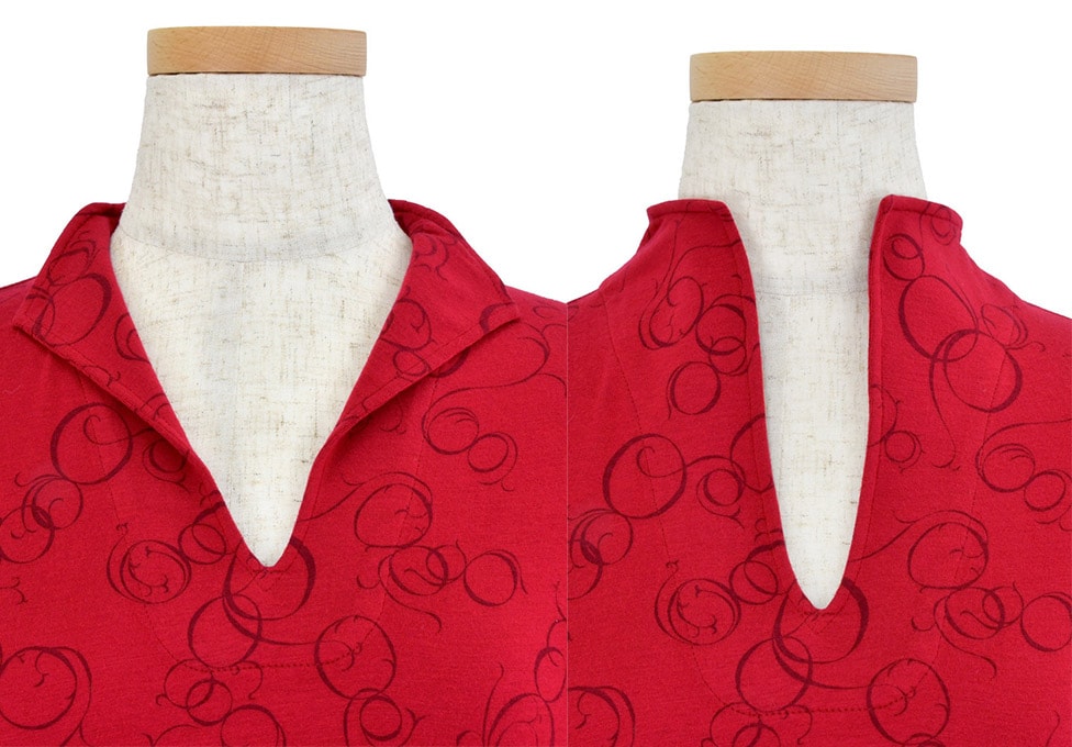 襟はスタンド襟にしても、前だけ開いても着ていただけます。