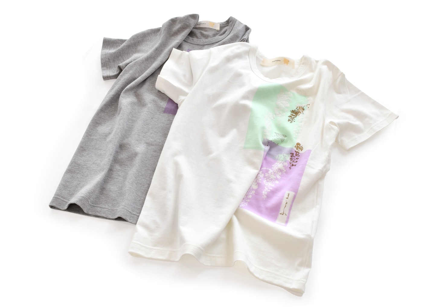 淡い色合いの染料で本の表紙を重ねて、ブランドロゴの千鳥や「まとふ」の文字を金や銀の顔料でプリントしています。