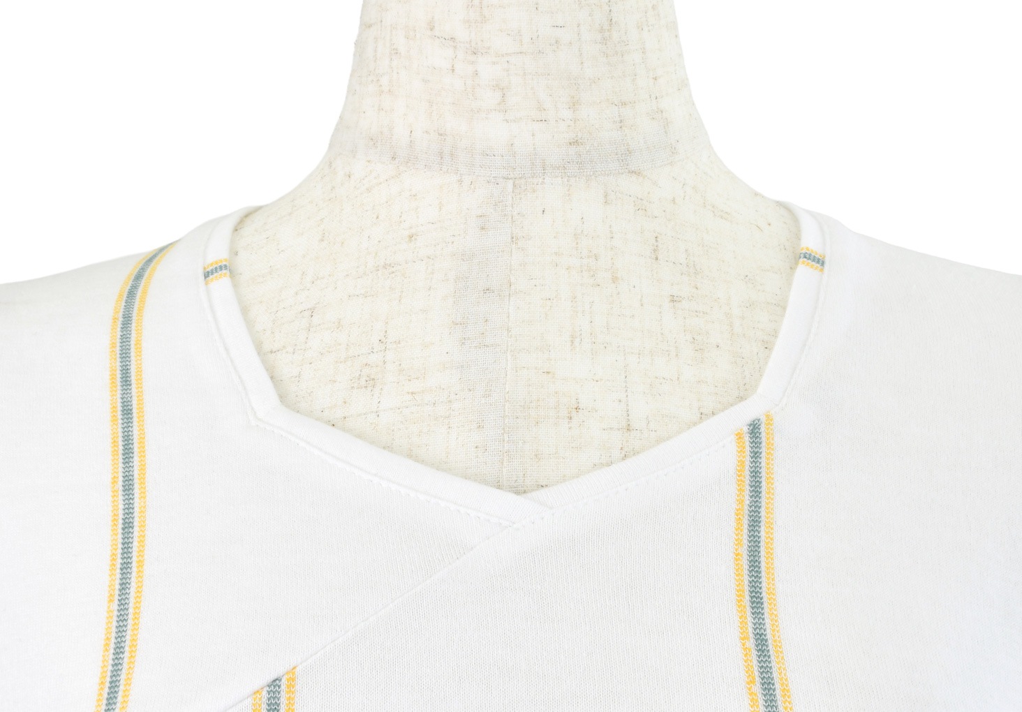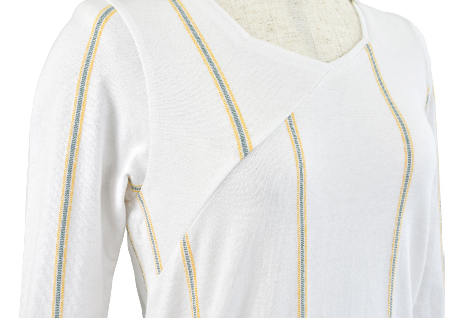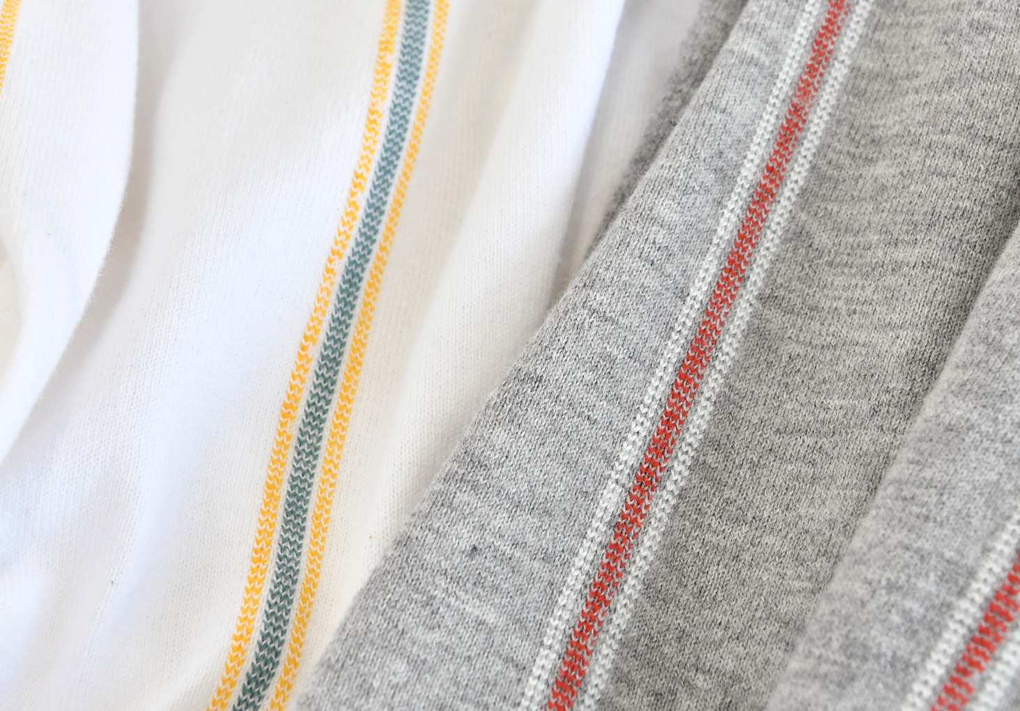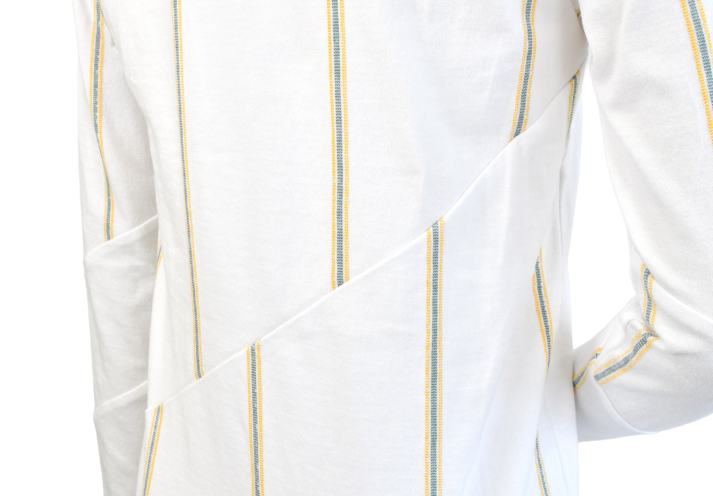 素材はコットン100%。ちょっとかすれたようなストライプの編み柄が味わいです。ストライプにすることで、斜めのドレープの動きがよりひきたちます。
